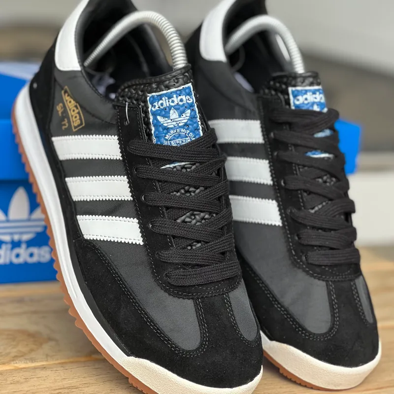 Discover the Adidas SL 72 sneakers in a sleek black and white design. Perfect for casual outings, these stylish shoes offer comfort and versatility for everyday wear.