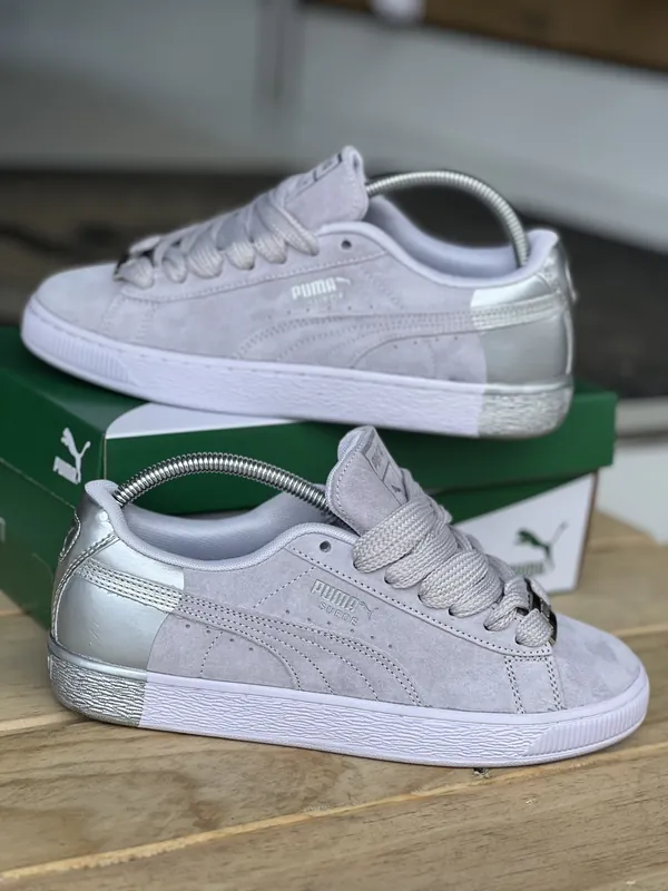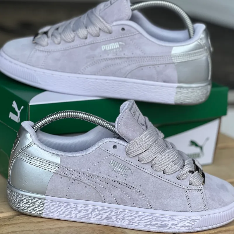 Discover the Puma Suede Two Face sneakers in grey suede with silver accents. Perfect for casual outings, these stylish shoes offer comfort and versatility for everyday wear.