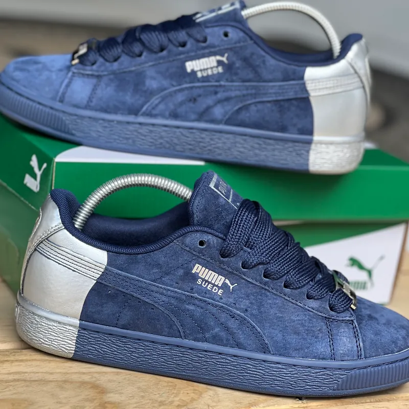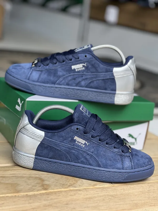 Discover the stylish Puma Suede Two Face sneakers featuring a unique blue suede design with silver accents, perfect for casual outings and everyday wear.